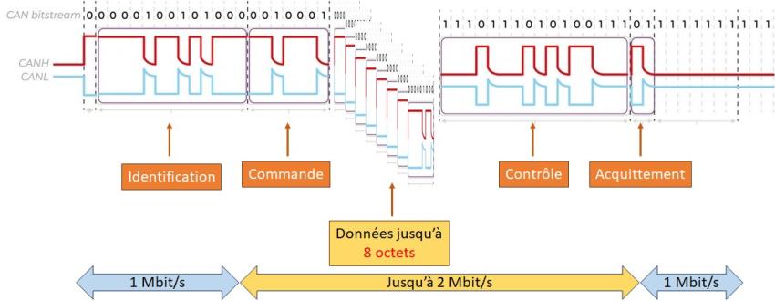Pour le CAN FD, on parle de taux de données flexible car il est capable de moduler sa vitesse de transfert dans une même trame. La vitesse de transfert est augmentée sur les champs "commande", "données" et contrôle".