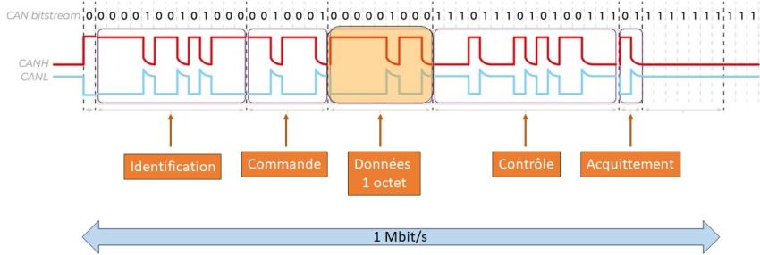 Pour une trame CAN HS, l'intégralité de la trame est envoyée à la même vitesse. La taille des données ne peut excéder 1 octet (8 bits).