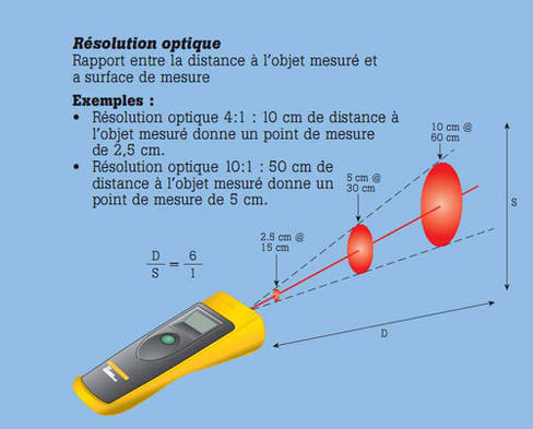 La résolution optique est fonction de la zone de mesure de l'objet testé et de la distance à l'instrument. On la définit également comme le rapport entre la distance de mesure et la surface sur laquelle est effectuée la mesure. Étudiez d'abord votre application ! Un instrument de mesure d'une résolution optique de 4:1 ne pourra être utilisé efficacement pour mesurer la température d'un objet situé à 1,5 m -même si le rayon laser du pointeur atteint cette distance. Essayez donc, avant tout achat, de déterminer comment vous allez utiliser votre thermomètre IR, puis choisissez un outil offrant une résolution optique adaptée à vos applications. De nombreuses lectures incorrectes proviennent en effet d'une erreur du technicien qui, sans le savoir, mesure une zone plus grande que l'objet visé !