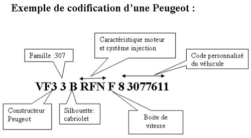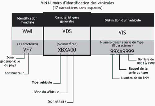 Chaque constructeur définit sa numérotation dans le cadre d'une législation internationnale: il s'agit du VIN (Vehicule Identification Number). Il est appelé aussi "numéro de chassis". Il se compose de 17 caractères que l'on retrouve sur le véhicule et sur la carte grise. On pourrait l'assimiler à la "carte d'identité" du véhicule."