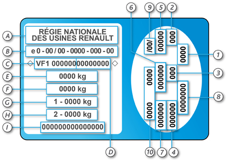 Renault utilise l'appelation "numéro de plaque ovale". Cette plaque constructeur se situe dans le compartiment moteur pour les véhicules avant 1996 ; elle est métallique. Pour les véhicules après 1996, elle se situe au niveau du pied millieu. La plaque est alors auto-adhésive et se déchire si on essaie de la décoller.