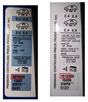 Peugeot utilise l'appellation "numéro de DAM" (Date Apparition Modification) et Citroën l'appellation "numéro d'OPR" (Opération Pièce de rechange). Ces numéros comportent 4 ou 5 chiffres et fonctionnent sur le même principe : ils correspondent à un jour particulier de fabrication (Le 05/04/2004 correspond à 10010). Sur les anciens véhicules (106, ZX, etc.) ce numéro est peint sur l'une des tourelles d'amortisseur dans le compartiment moteur. Pour les véhicules plus récents (207, C4 etc.) ce numéro est intégré sur une vignette où est mentionné également la pression des pneus ; cette vignette est implantée dans le pied de porte conducteur.