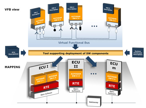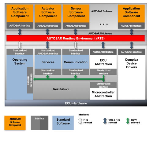 · RTE : RunTime Environnement, c'est l'environnement logiciel qui va implémenter les fonctions du VFB pour un ECU spécifique. Mais cette tâche peut être autant que possible déléguée au logiciel de base (BSW).