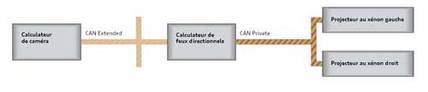 Les positions que le tambour doit atteindre sont transmises aux deux projecteurs via le bus CAN Private. Les électroniques intégrées aux projecteurs pilotent selon les instructions du calculateur de feux directionnels leurs moteurs de réglage pour que la chaussée soit éclairée de façon optimale conformément à la situation momentanée de la circulation.