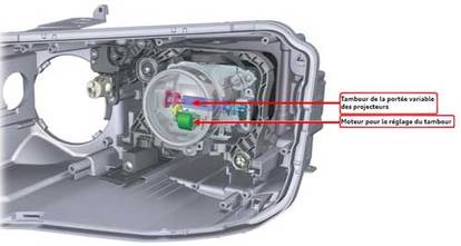 Pour régler le site des projecteurs, un tambour a été monté dans les deux projecteurs. Ce tambour est muni d'un profil bien spécifique qui engendre l'éclairage souhaité de la chaussée lorsque le tambour tourne, entraîné par un moteur (DC) de réglage. C'est de cette manière que l'on règle la portée des projecteurs avant.