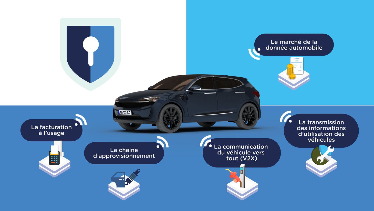 Dans la perspective de l'automatisation complète des véhicules, la blockchain permet d'envisager un échange d'informations ou d'argent entre différents véhicules et entre des véhicules et une infrastructure ou d'autres objets IoT.