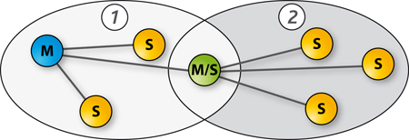 Un calculateur peut ainsi être esclave d'un piconet et maître d'un autre. La figure ci-dessous montre un exemple d'organisation de deux piconets. Un réseau peut donc comporté 71 calculateurs interconnectables