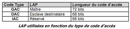 - Device Access Code (DAC) : Ce code d'accès est utilisé pour certaines procédures de demande de réveil. Ce code ne possède pas le champ Trailer. Sa longueur est donc de 68 bits seulement.