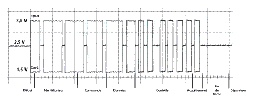 Les deux fils torsadés s'appellent CAN H et CAN L. Les informations y circulant sont complémentaires pour le CAN high speed et symétriques pour le CAN low speed.