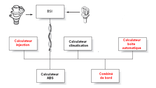 Le BSI reçoit l'information vitesse véhicule en provenance du capteur. Le BSI code cette information et l'envoie par le réseau à tous les calculateurs présents sur ce réseau et seuls les calculateurs (en rouge) qui ont besoin de cette information la décodent.