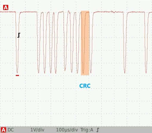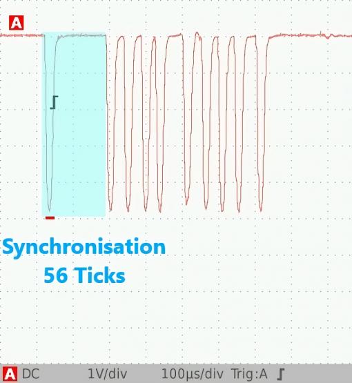 Cette partie de la trame est composé de 56 Ticks. Le calculateur divise alors le temps total de la synchronisation par le nombre de Tick et obtient la valeur d'un seul. En règle générale, la valeur d'un Tick est de 3 µs.