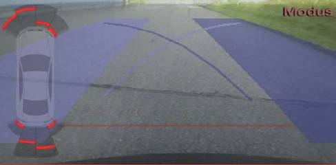 Lorsque le véhicule roulant en marche arrière s'approche d'un obstacle, une représentation graphique est projetée en surimpression dans la vue de la rétrocaméra par l'OPS (Optical Parking System), à partir d'une distance définie par rapport à l'obstacle. L'obstacle est ici détecté par les capteurs à ultrasons de l'aide au stationnement.