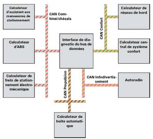En vue du fonctionnement correct de l'aide au stationnement, le calculateur d'assistant aux manoeuvres de stationnement échange les informations suivantes avec les calculateurs ci-dessous :