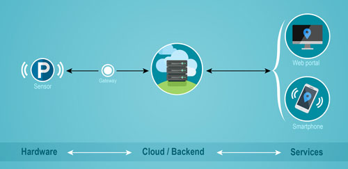 Un capteur au centre de la place, une connexion vers un serveur central (sur le cloud) puis une interface vers les applications des utilisateurs. Le capteur détecte l'état de la place, Le serveur central ou « data center » contient les « méta données » (tailles, tarifs, fonctions, équipements, etc.) et génère les cartes interactives en temps réel des parkings pour les applications d'utilisateurs.