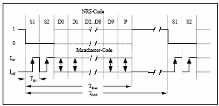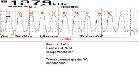 Sur le câble, les niveaux de courants (modulants) sont codés en Manchester: