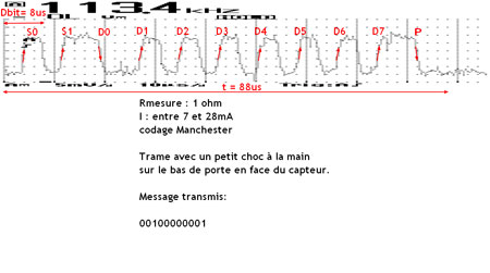 Au moment où il y a modulation du courant pour transmettre, on voit une légère chute de tension sur l'alimentation du capteur. Cette modulation respecte une norme.