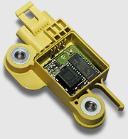 Le capteur est composé d'un élément de mesure et d'un circuit de traitement spécifique qui analyse la mesure et la retransmet par courant porteur. Concrètement, cela signifie que ce capteur est alimenté par 2 fils et retransmet par ces mêmes fils les données d'accélération vers le calculateur central du système d'airbag.