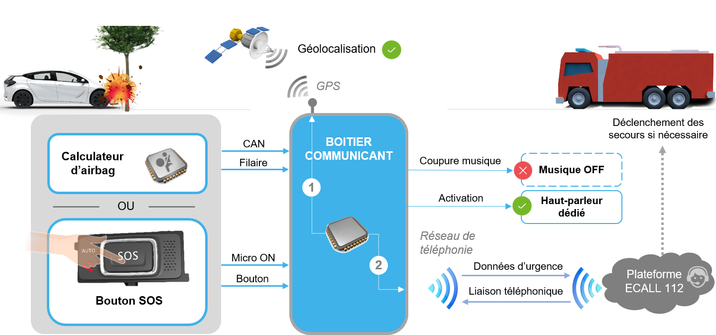 Tout d'abord, instantanément après un accident, si un ou plusieurs éléments pyrotechniques du système airbag ont été déclenchés, ou si un choc important est détecté par le véhicule, l'appel Ecall est envoyé automatiquement vers la plateforme 112.