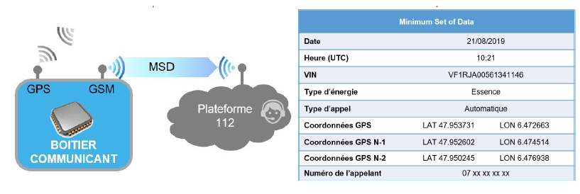 Le message MSD est envoyé au service de secours (112) au format SMS en même temps que l'appel d'urgence (automatique ou manuel).