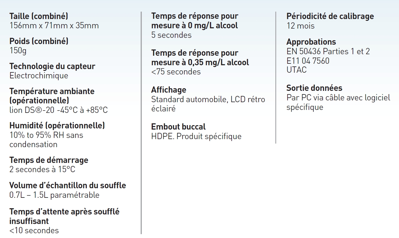 | Constructeurs concernés | Equipementiers seconde monte : LIONLaboratoires, Alcolock, Smartstart, Draeger, Autowatch, Pass N Go |