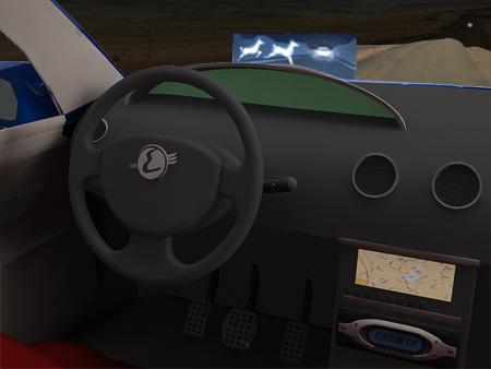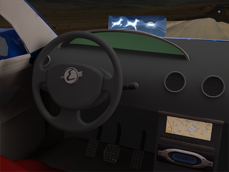Cette image est affichée sur un écran plat intégré à la planche de bord ou sur le pare brise (affichage tète haute)