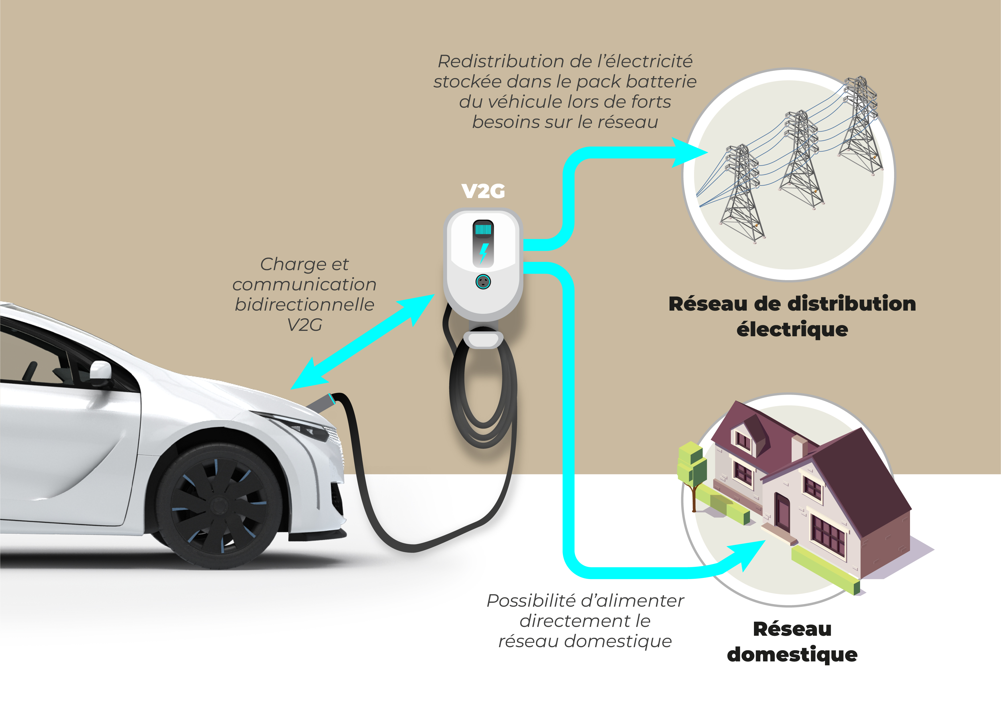V2G : Vehicle to Grid / Véhicule au réseau : Permet d'utiliser l'énergie du véhicule pour alimenter le réseau électrique afin de limiter les pics de consommation sur celui-ci.