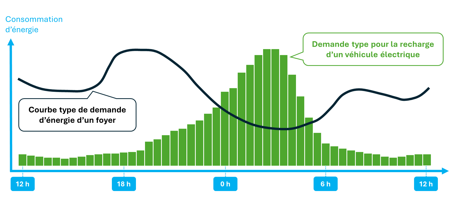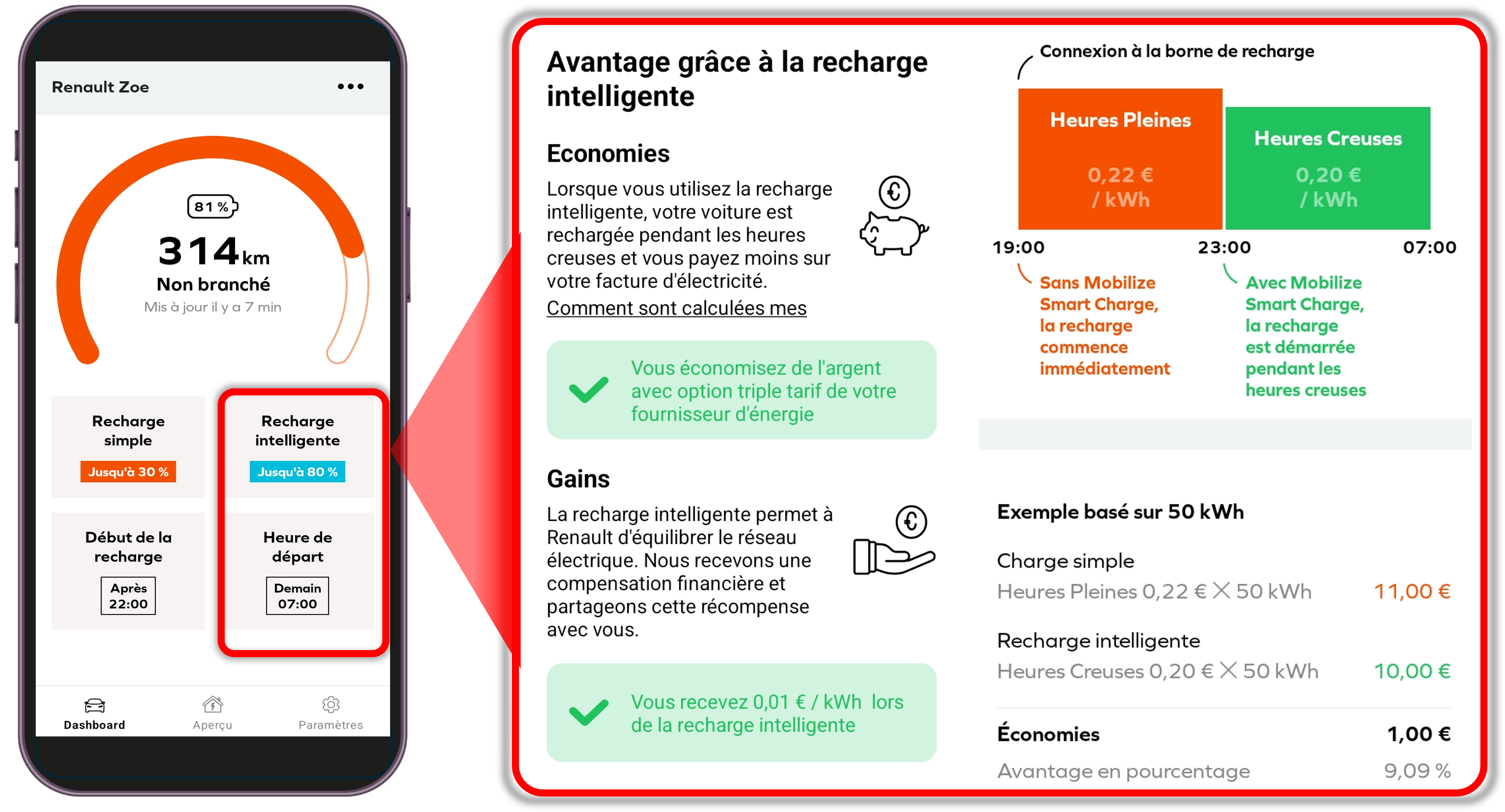L'échange de données entre le véhicule et le point de recharge "intelligent" permet d'optimiser la recharge en modulant la puissance de charge selon la capacité du réseau électrique. La recharge sera donc privilégiée durant la nuit.