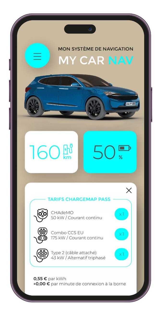 Des fonctionnalités supplémentaires permettent de faciliter la recharge lors d'un long déplacement (état des bornes de recharges, réservation à distance...). |