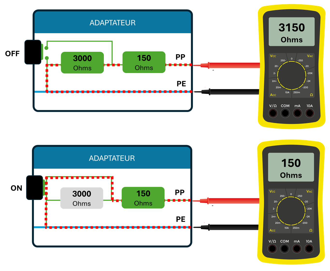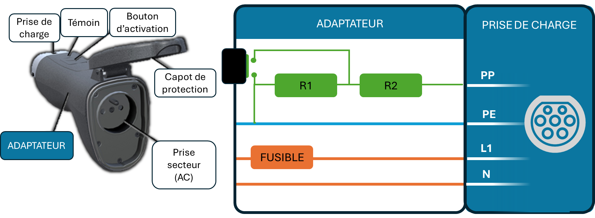 Le courant AC est donc disponible en sortie de prise. Pour des raisons de sécurité, l'adapteur V2X intègre des résistances internes pour informer le véhicule de la présence d'un adaptateur.