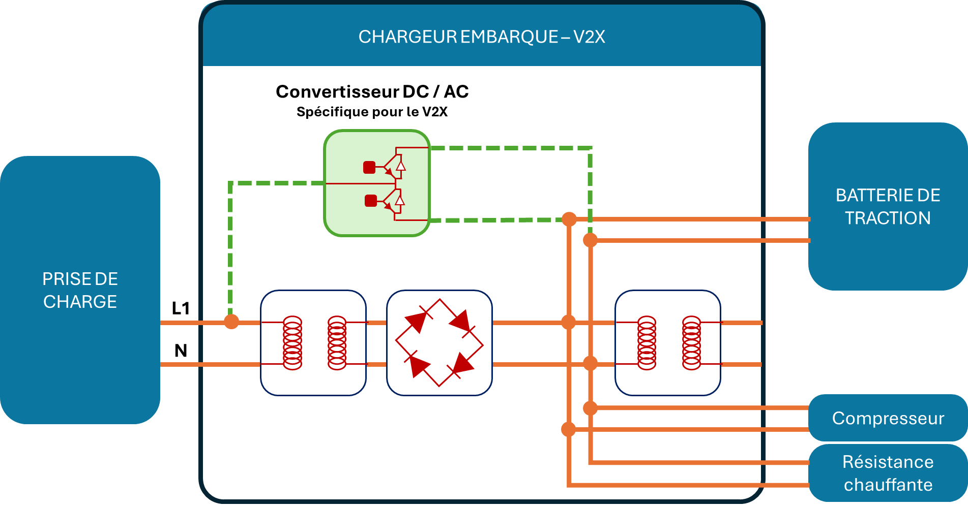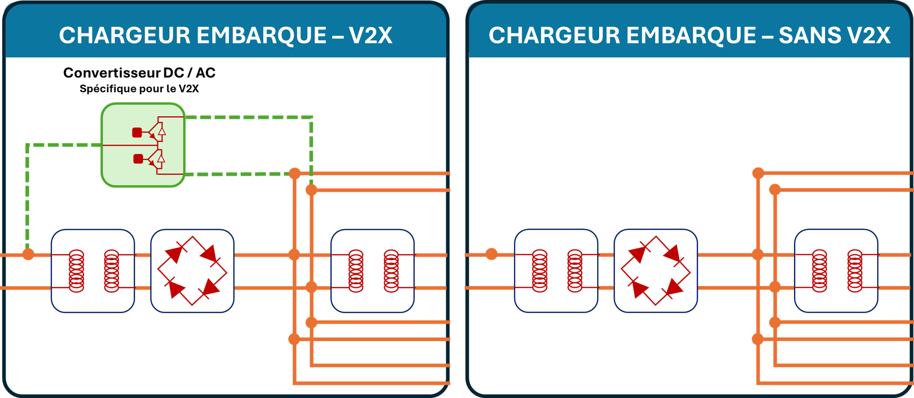 Le chargeur embraqué est spécifique car il doit être réversible.