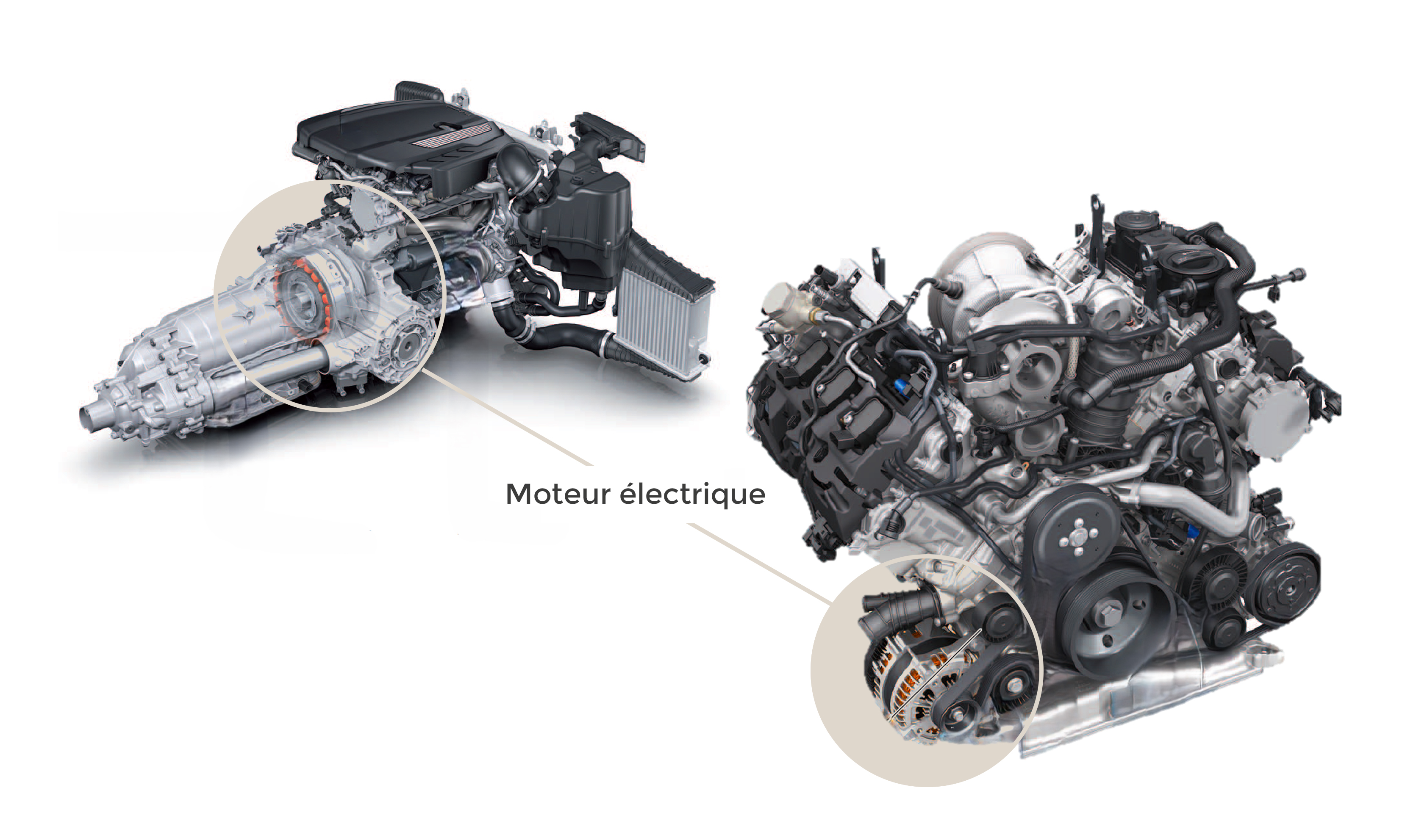 Le véhicule équipé de la technologie "Mild-Hybrid" est majoritairement équipé d'un moteur essence associé à un moteur électrique implanté entre le moteur à essence et la transmission. Lors d'un freinage ou d'une décélération, l'énergie cinétique est transformée en énergie électrique par le moteur électrique et emmagasinée dans le pack batteries pour un usage ultérieur.