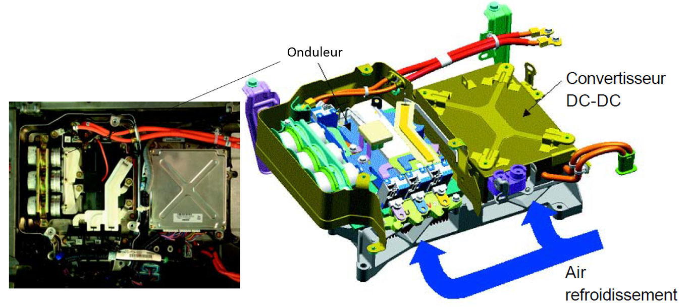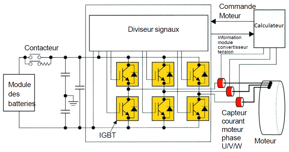 L'onduleur utilise un montage en pont comprenant six transistors bipolaires à grille isolée pour effectuer la conversion entre le courant continu du module des batteries et le courant alternatif triphasé du moteur électrique. Ce module comprend un circuit de commande qui pilote les transistors IGBT en fonction des demandes d'assistance et de régénération du moteur, envoyés par le boitier de gestion électronique.