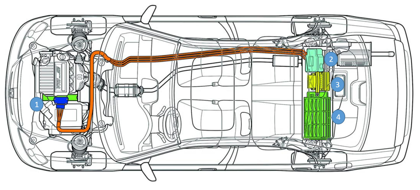 Le moteur électrique est généralement un moteur synchrone triphasé léger et très efficace, assurant plusieurs fonctions. Plus spécifiquement, il fonctionne comme un moteur d'assistance pour la puissance moteur et agit comme une génératrice électrique pour la conversion de l'énergie dynamique en énergie électrique pendant la décélération. Ce moteur fait également office de démarreur pour le moteur à essence.