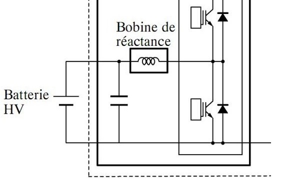 Il y a aussi intégré à l'électronique de puissance le convertisseur CC/CC. Le rôle du convertisseur va être de transformer la tension de la batterie de traction en 12 V pour recharger la batterie de servitude.