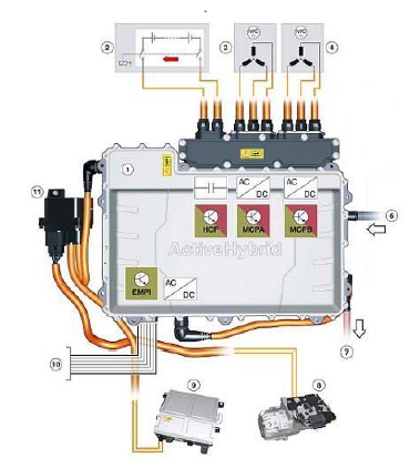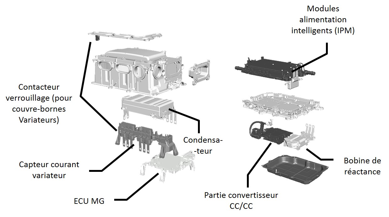 Pour que l'ensemble fonctionne, les véhicules électriques et hybrides disposent d'une électronique de puissance qui va transformer le courant continu de la batterie en courant alternatif pour le moteur lors des phases de roulage. Cette électronique de puissance va aussi transformer le courant alternatif du moteur en courant continu pour recharger la batterie lors des phases de décélération.
