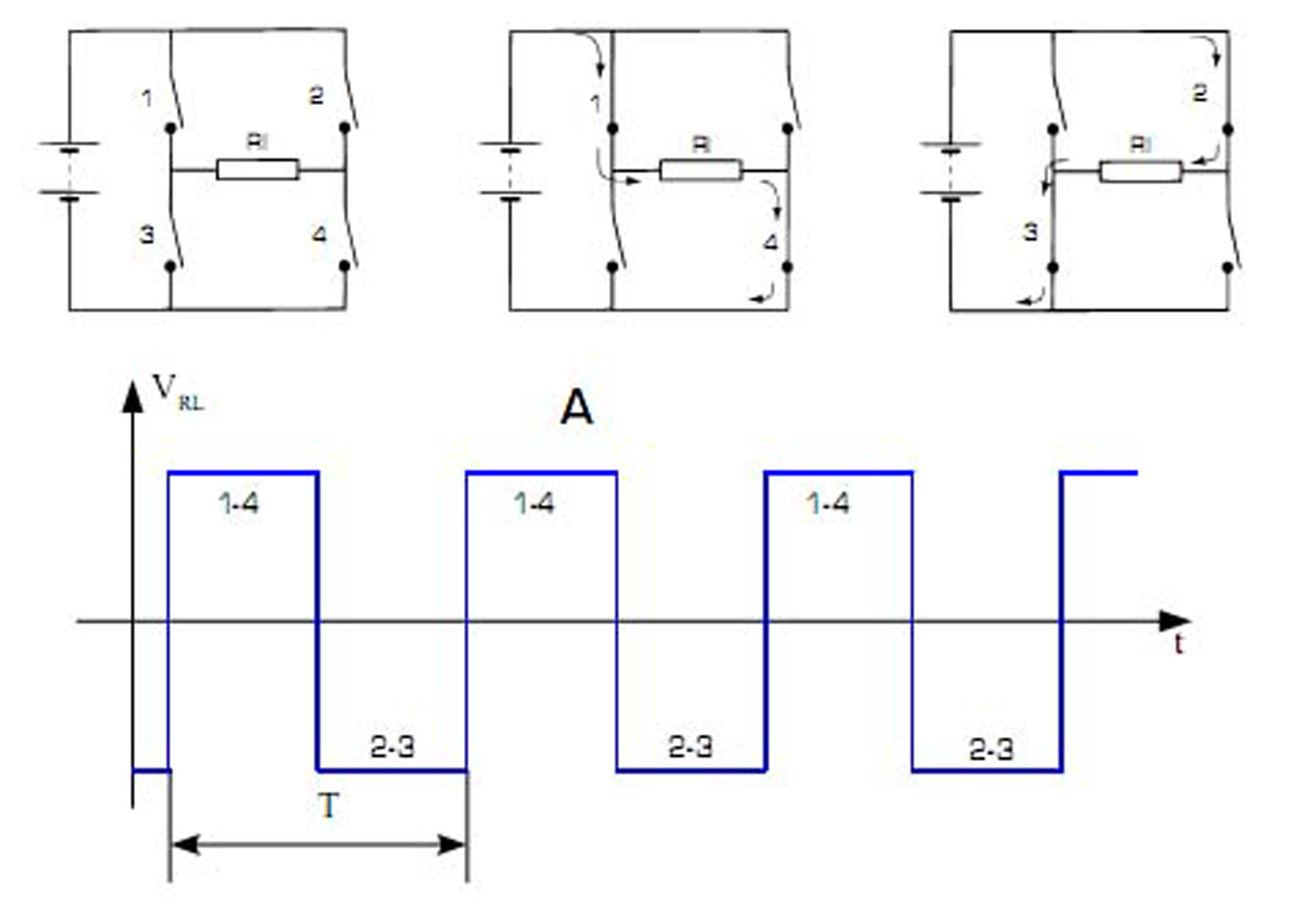 L'alimentation en courant alternatif du moteur est réalisée à travers un onduleur. Le fonctionnement de l'onduleur utilise le principe du pont en H.