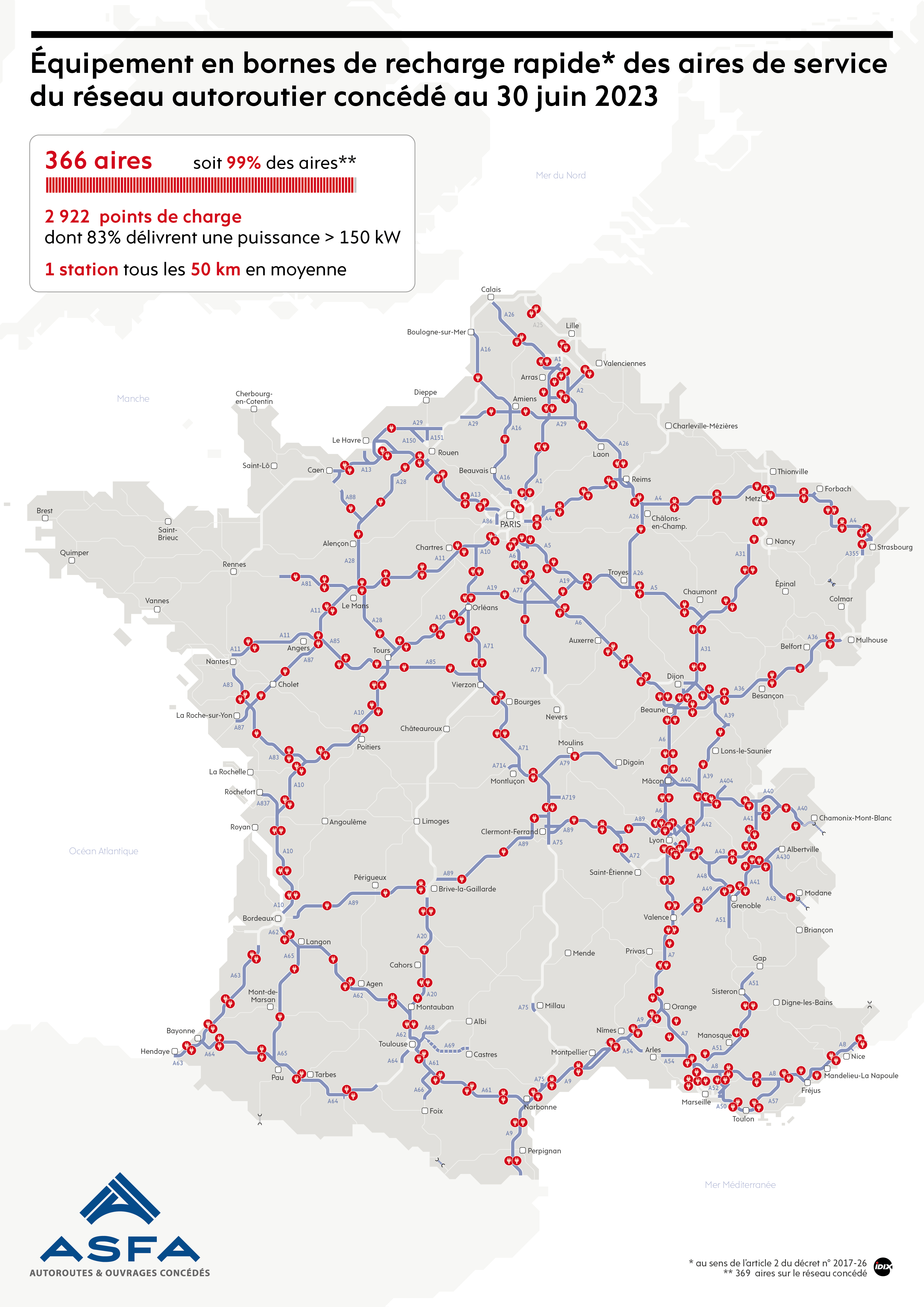 L'Europe préconise sur les axes autoroutiers, un point de charge tous les 60 km en moyenne. Avec le bon qui a été fait entre 2022 et 2023, c'est un point de charge rapide tous les 50 km en moyenne, dont sont équipées aujourd'hui, nos aires de services sur autoroute.
