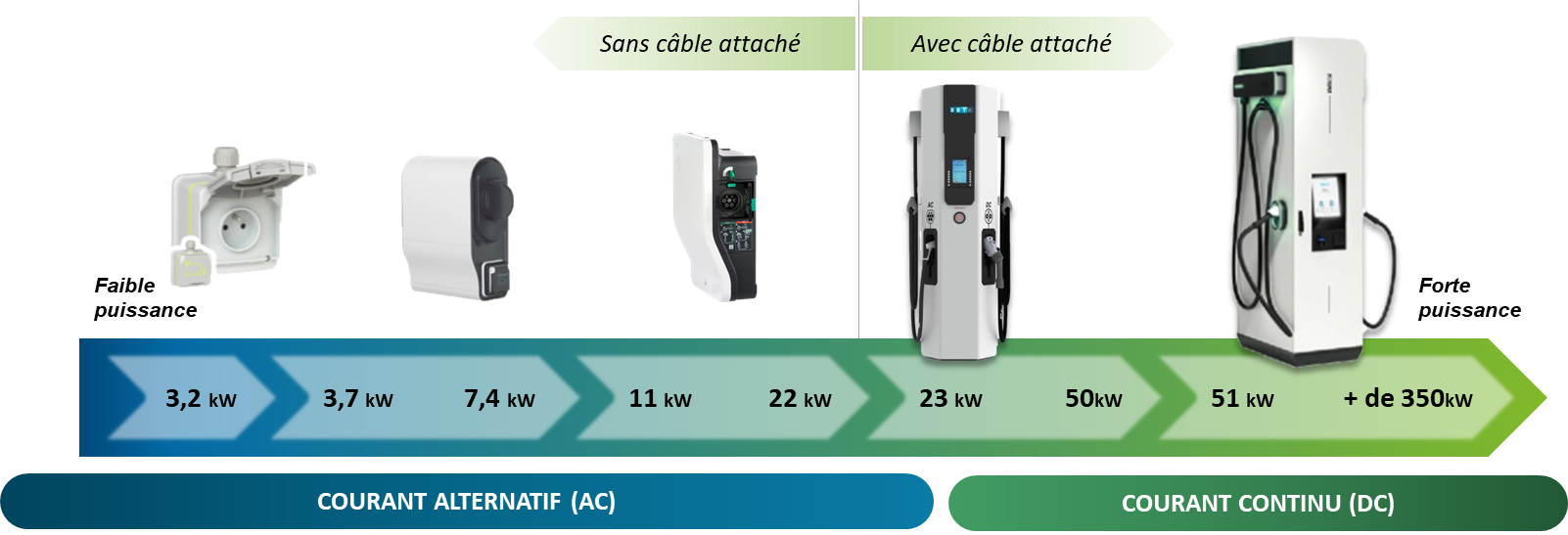 • Les bornes de recharge DC ont des puissances pouvant aller de 22 à plus de 350 kilowatts.