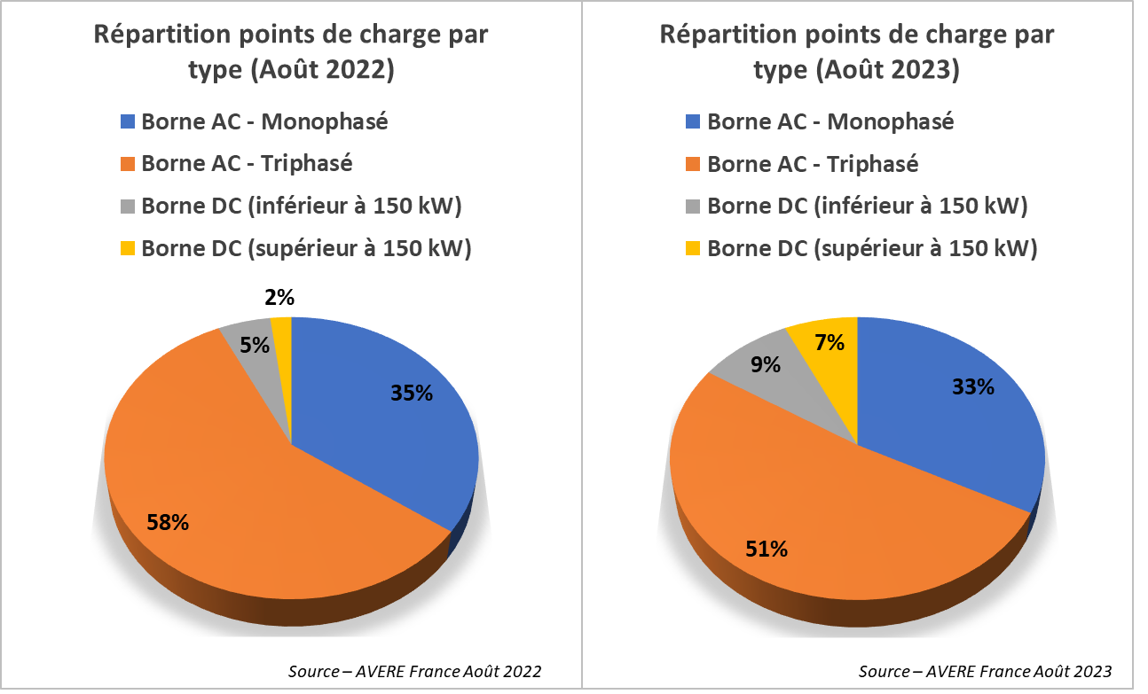 En revanche, les bornes AC triphasés ne représentent plus que 51 % du nombre totale de bornes, au profit de bornes DC, présentant des puissances supérieures.