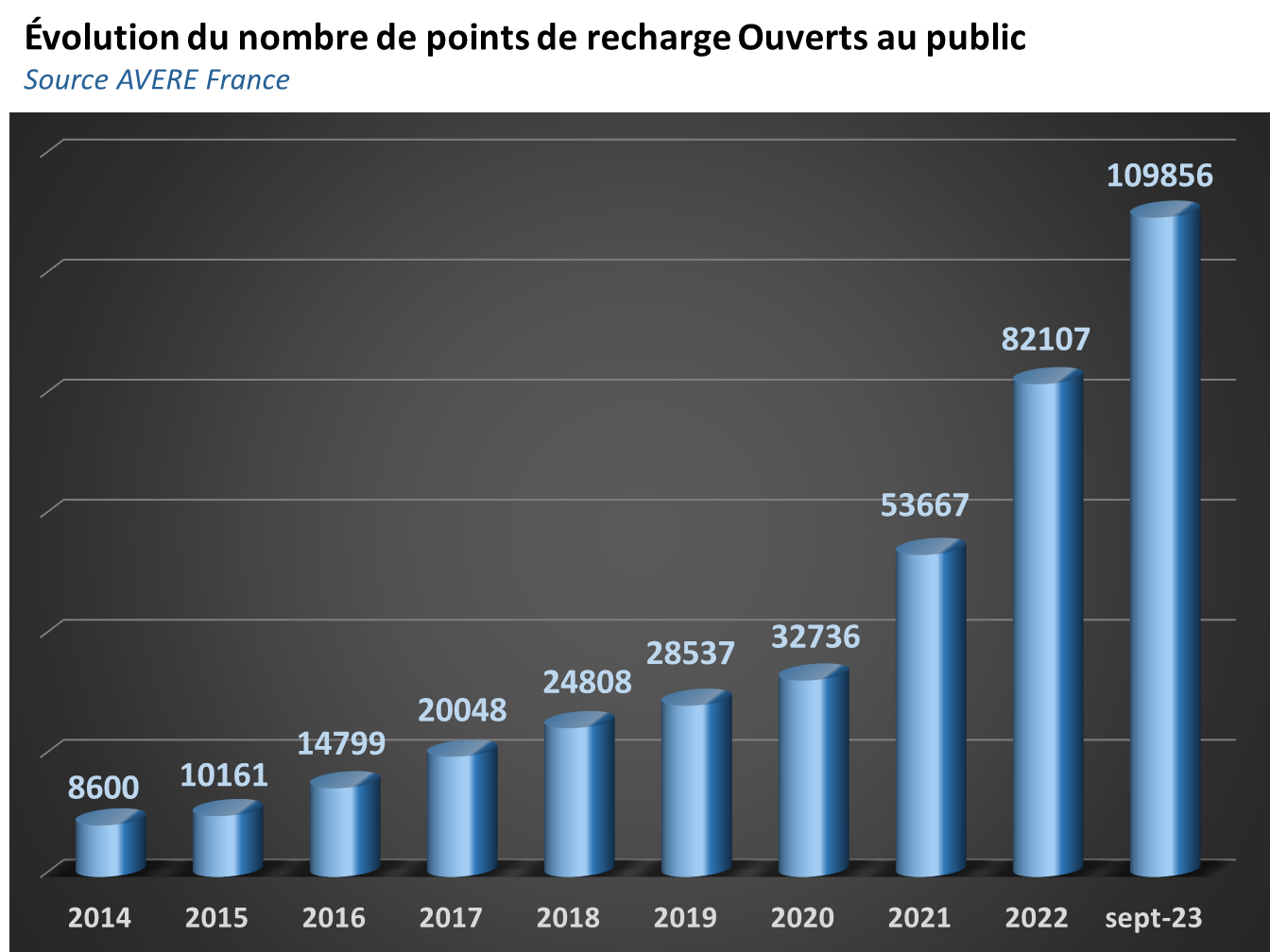 Avec presque 110 000 points de recharge sur le territoire, c'est 10 fois plus qu'en 2015, année où seulement 10161 points de recharge étaient recensés.