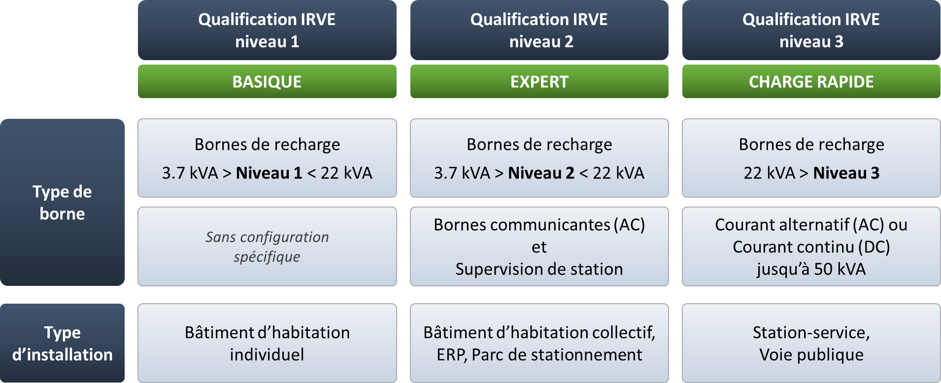 Il existe 3 niveaux de qualifications à l'installation d'une IRVE :