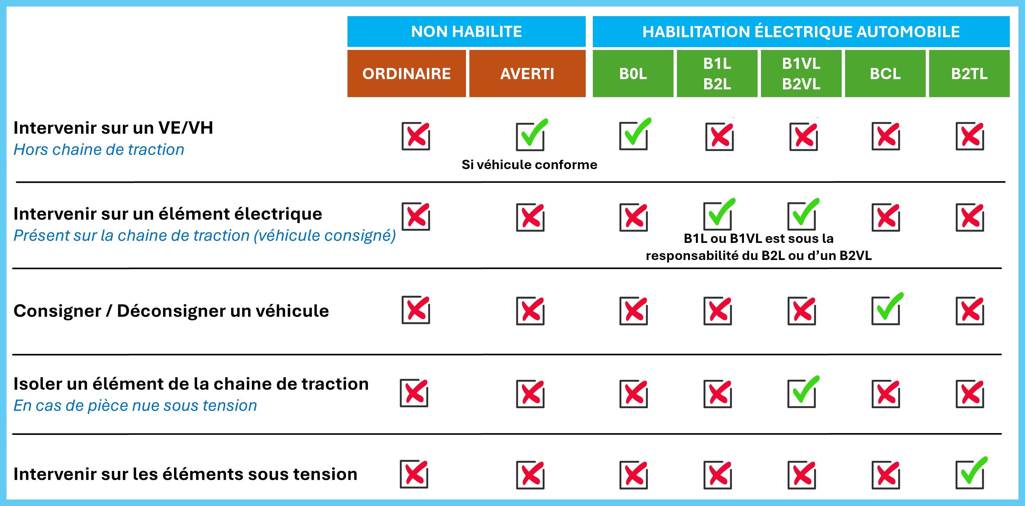 Votre titre d’habilitation est lié à une norme délimitant votre périmètre d’action. Les métiers de l’automobile sont liés à la norme NFC 18-550. Cette norme ne vous autorise pas à travailler sur les infrastructures électriques (prise, borne de recharge…)