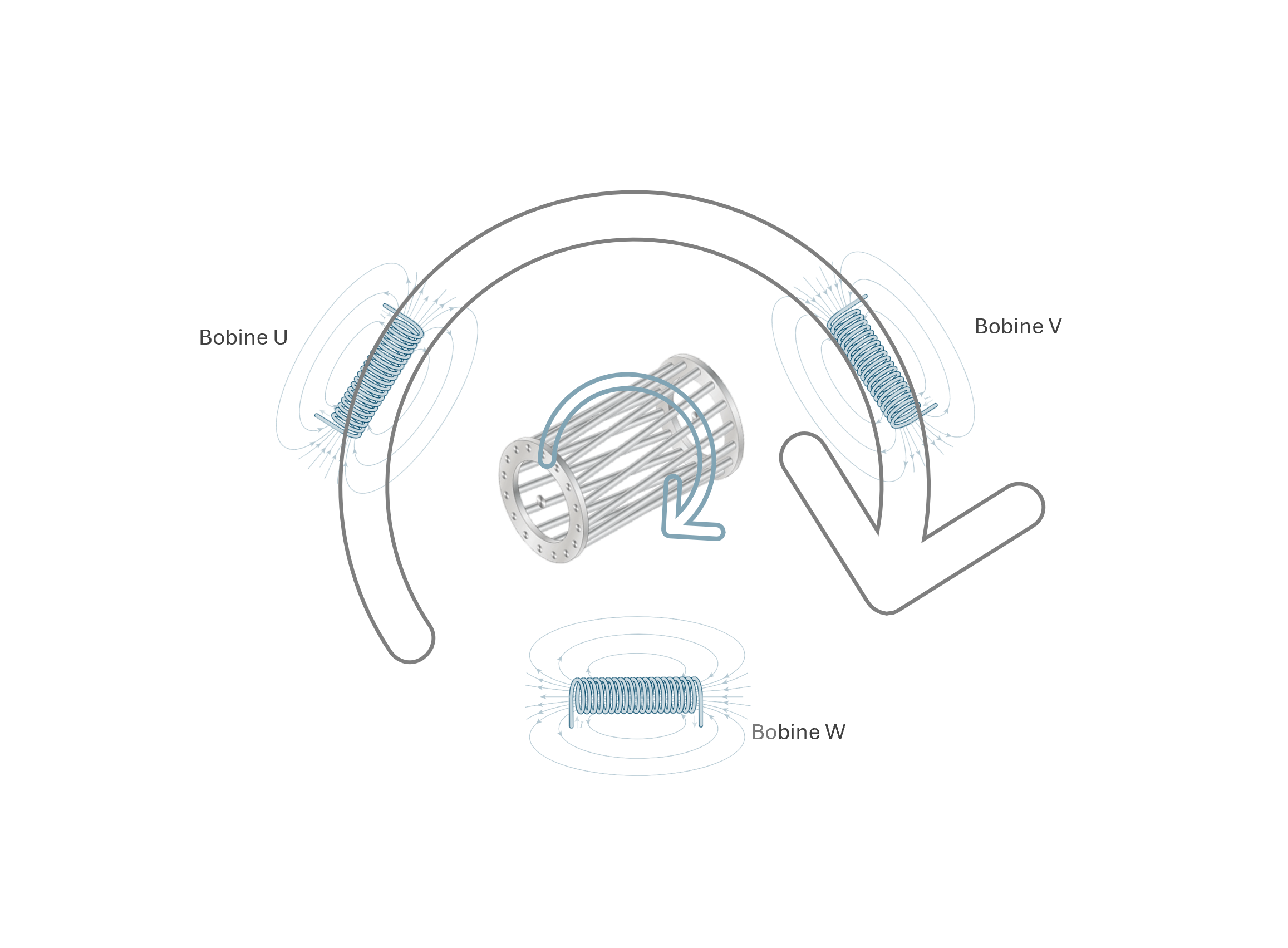 Dans l'illustration, les flèches représentent la circulation du courant électrique. La circulation de ce courant fait apparaître un champ magnétique, avec des pôles, comme dans tout conducteur électrique, qui reçoit un courant.