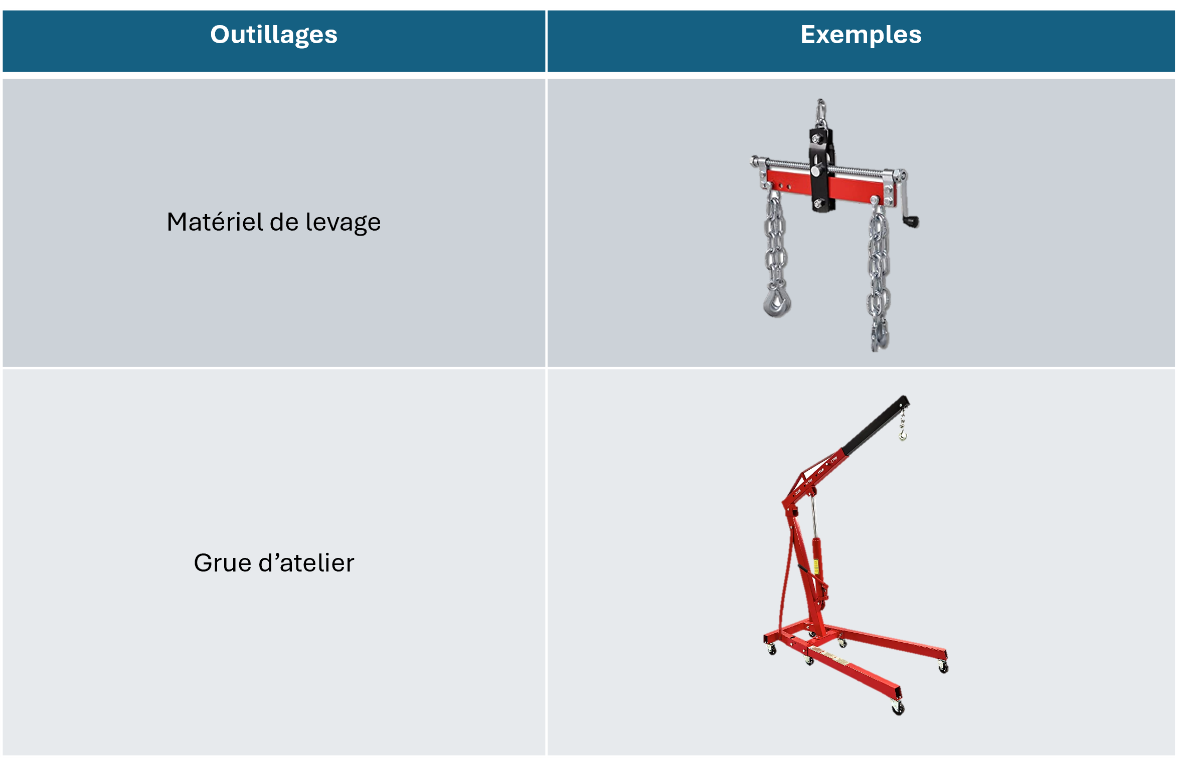 Exemple d’outillage approprié