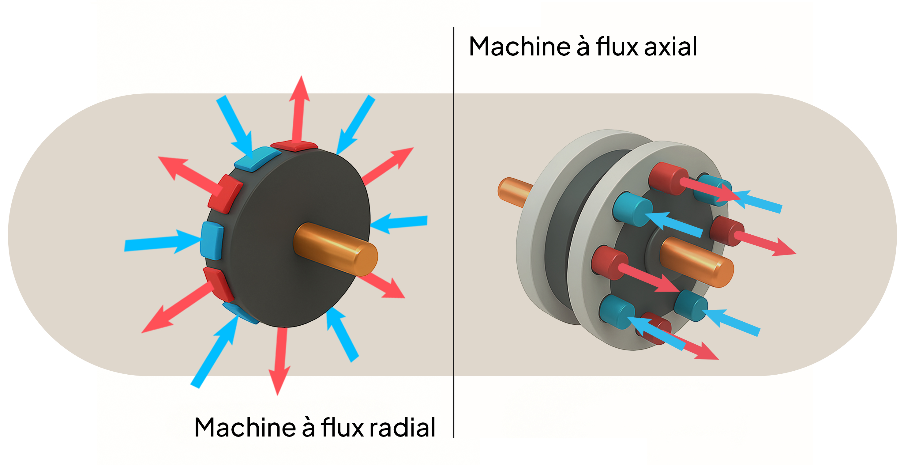 - Les machines à flux axial bénéficient d’un trajet du flux plus court, souvent unidimensionnel, ce qui réduit les pertes fer* (hystérésis et courants de Foucault) et améliore le rendement global.