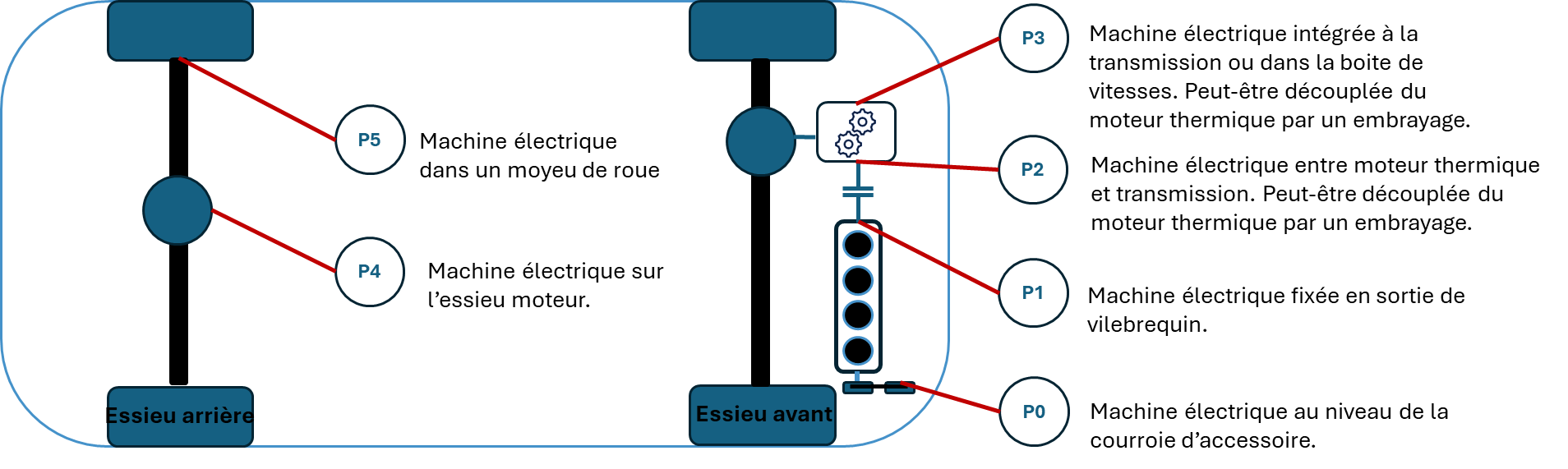 La société des ingénieurs de l'automobile (SIA) à défini un codage pour l'emplacement des machines électriques dans la chaine cinématique d'un véhicule.
