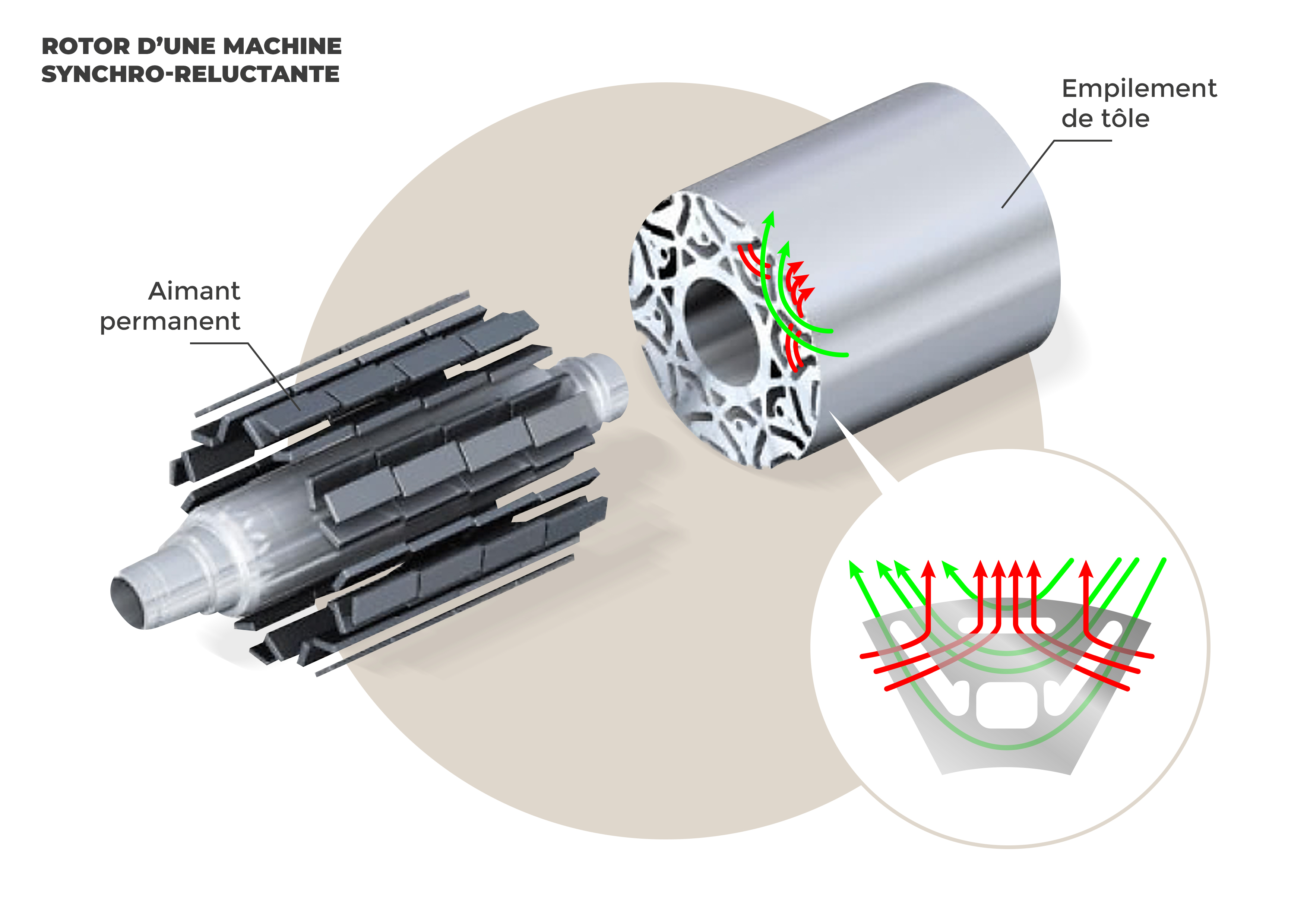 Ces machines sont aussi appelées machine synchrone IPM pour Internal Permanent Magnet. Les aimants sont insérés dans le rotor, ce qui apporte plusieurs avantages.