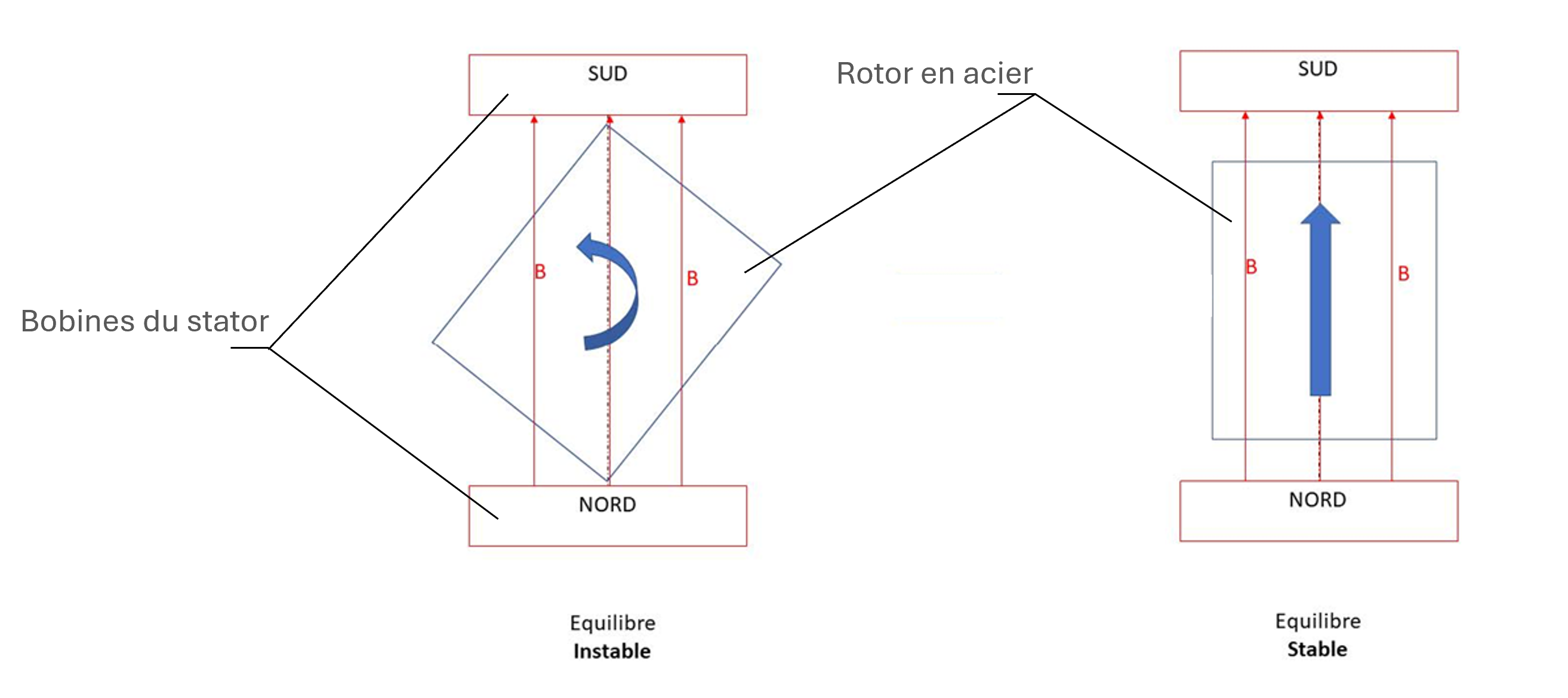 - On s'aperçoit que le rotor à tourné pour s'aligner sur les lignes de champ. Le phénomène de réluctance à bien exercé un couple sur le rotor le forçant à tourner.