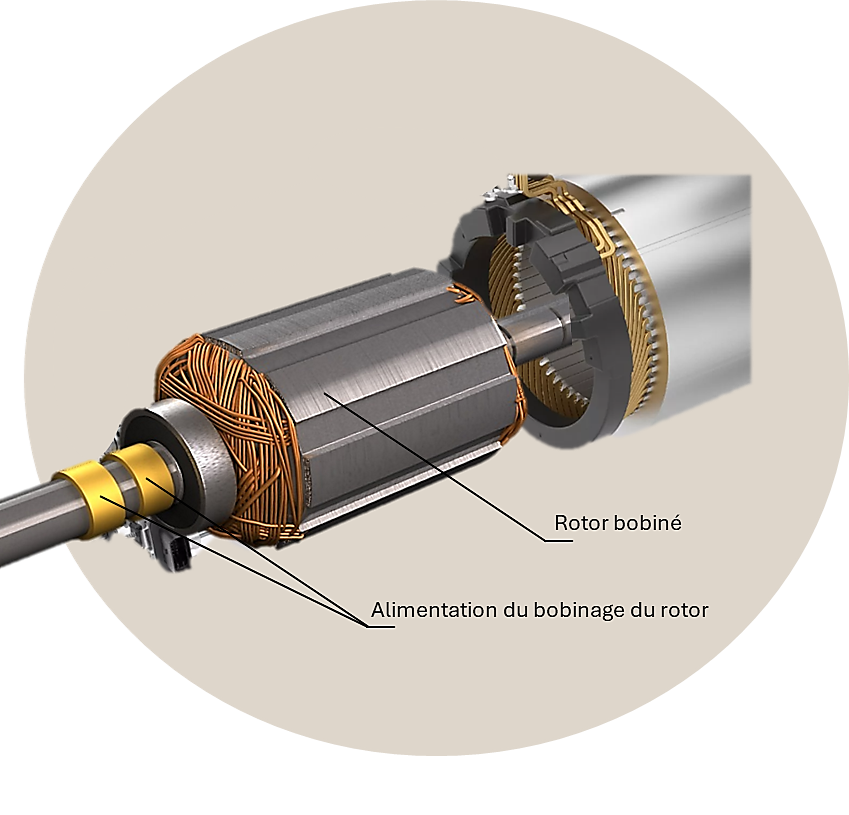 La spécificité de cette machine, c'est de se passer d'aimants permanents pour la conception de son rotor. Les pôles magnétiques nord et sud du rotor sont réalisés par un bobinage de cuivre et une alimentation électrique.