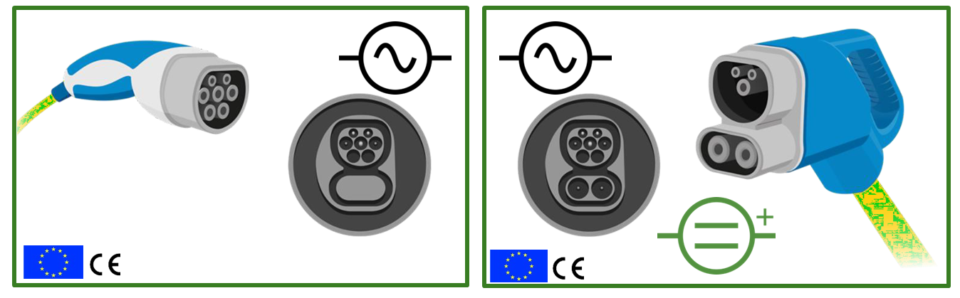 Un véhicule léger est équipé d'une prise de charge de type 2 pour la recharge en courant alternatif ou d'une prise combo CCS pour la recharge en courant continu. Il est possible de retrouver ces 2 moyens de recharge sur un poids lourd selon son besoin de recharge.
